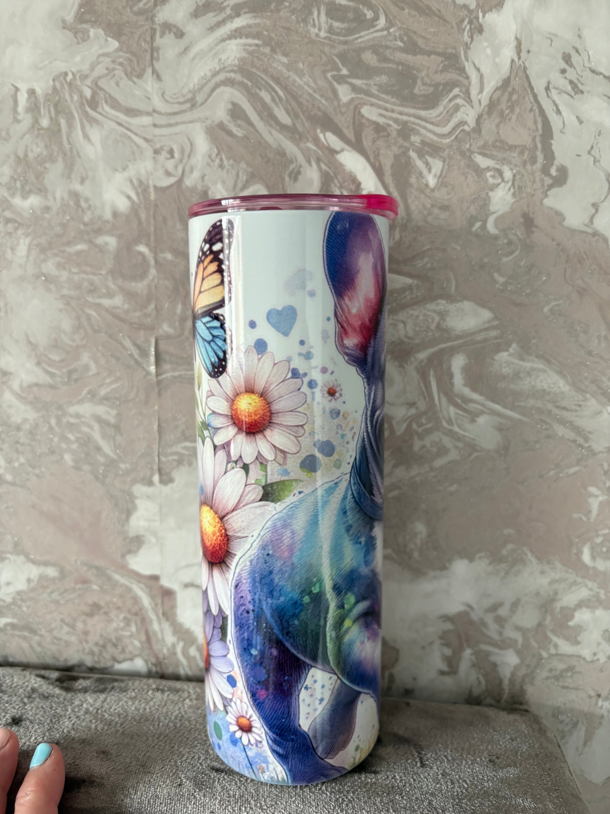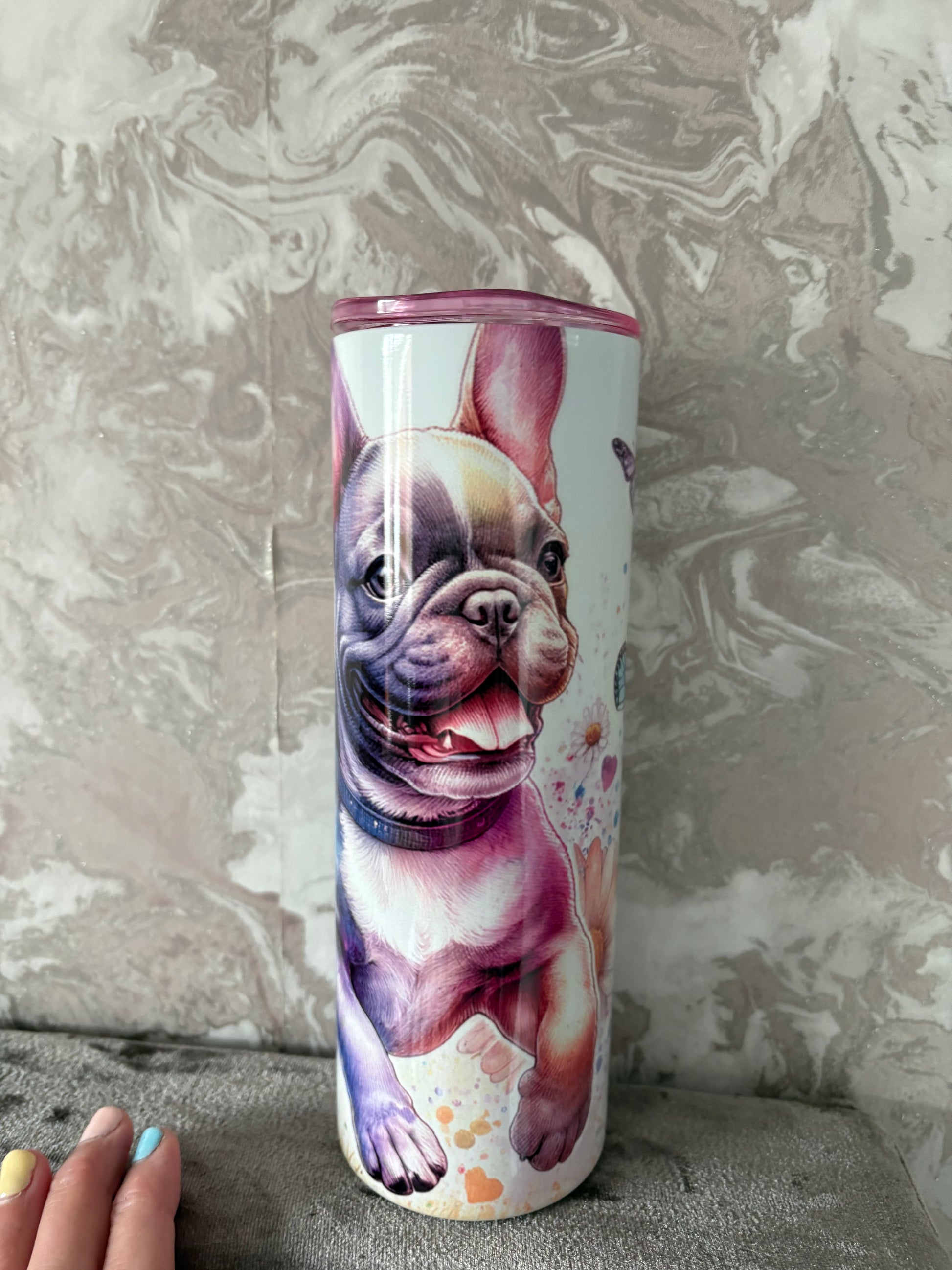 Handmade 20oz French bulldog tumblers only 4 lid colour in variants thay come with straw and boxed hot drink 6hours cold 12 hours